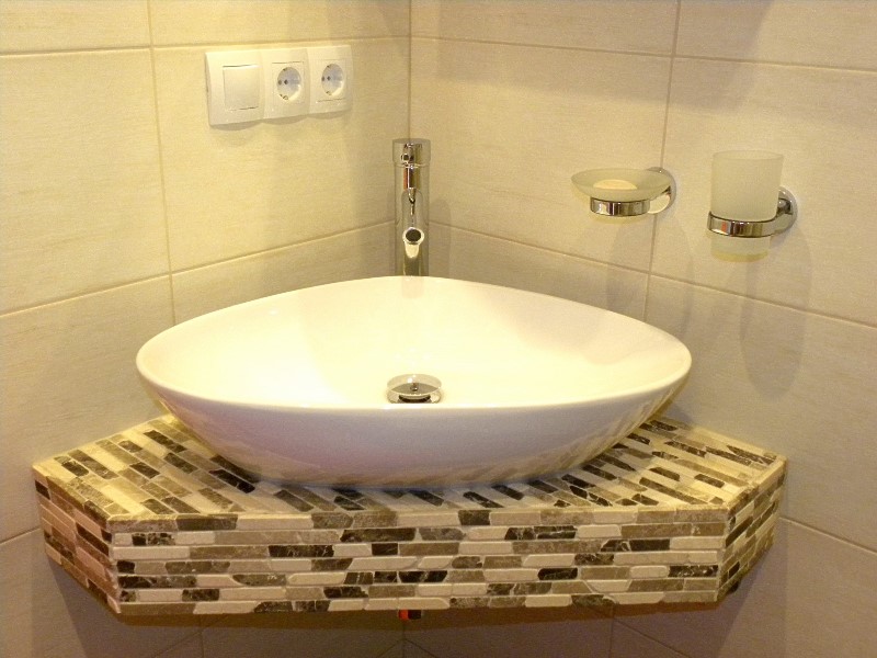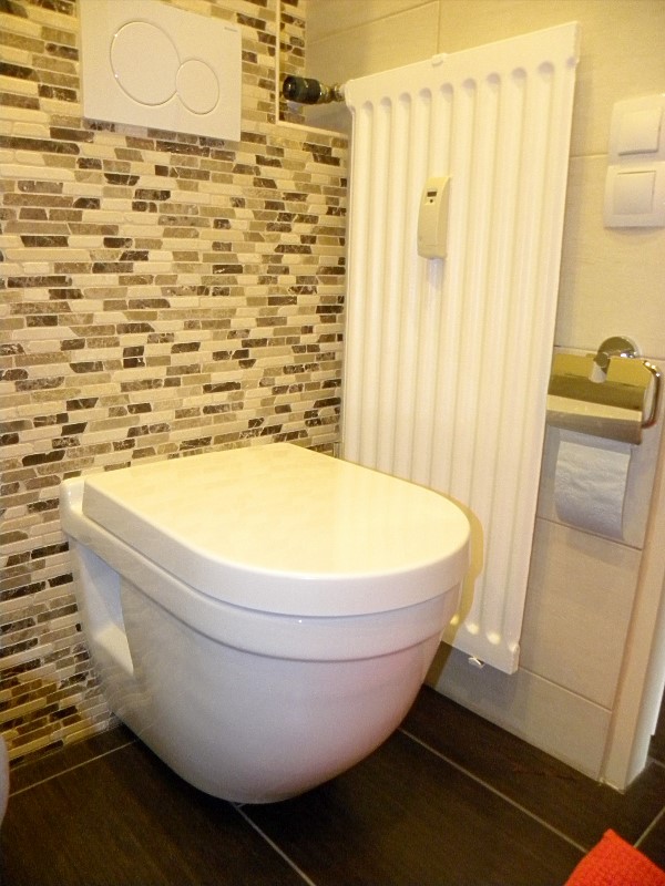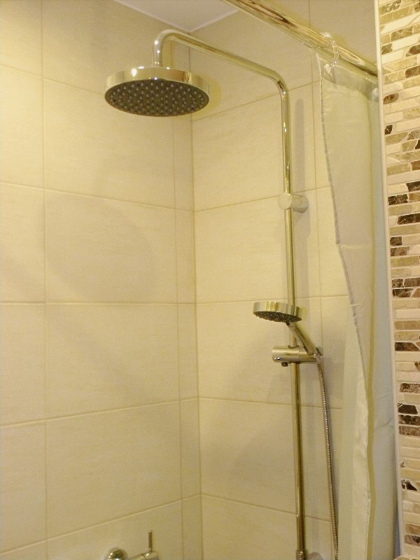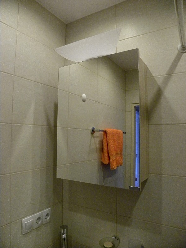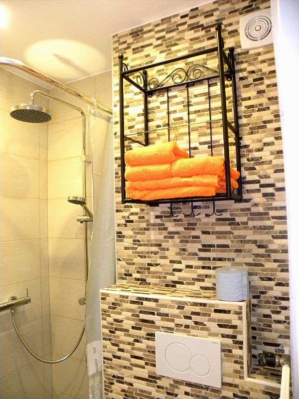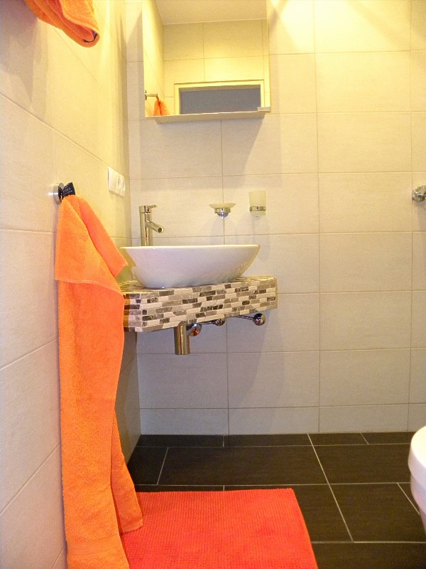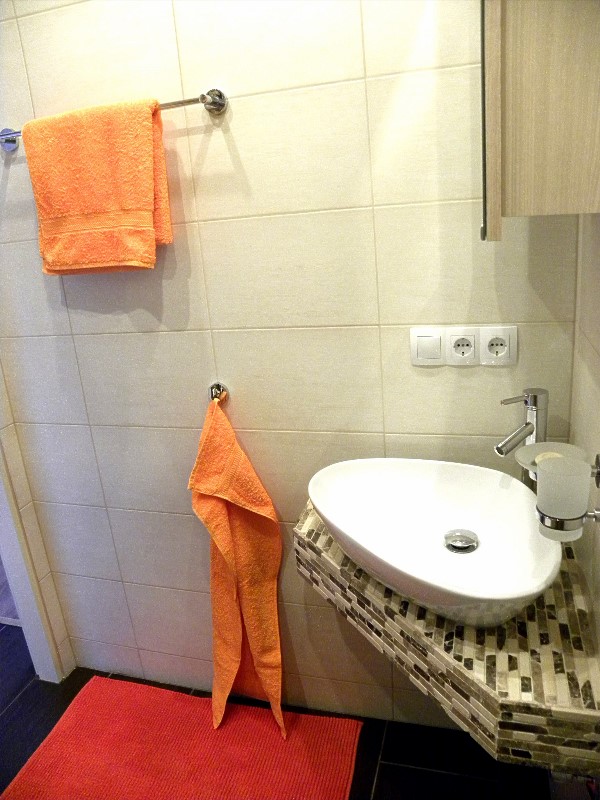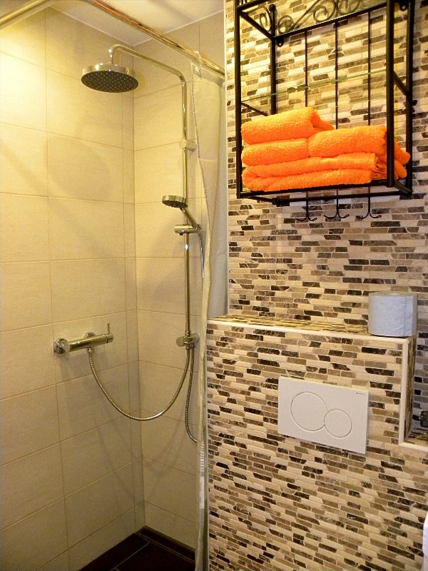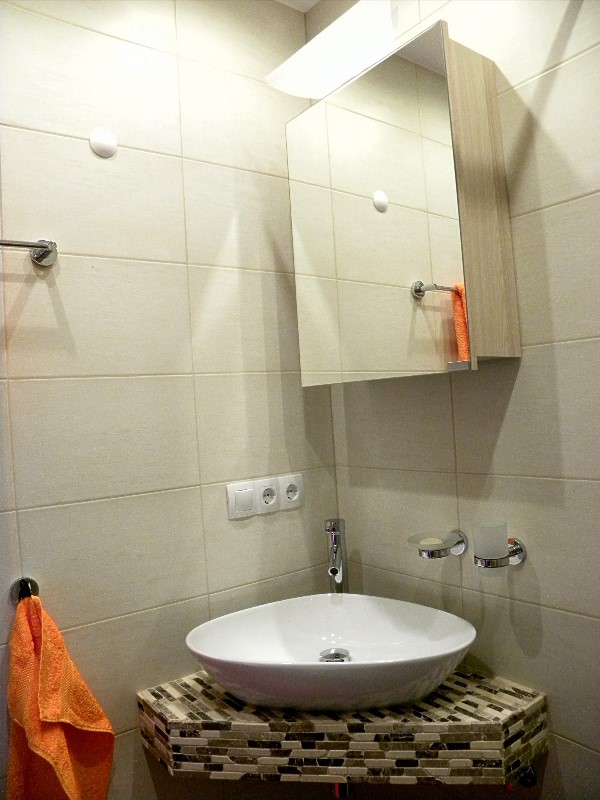 Regendusche, Handtücher, Waschbecken, Spiegelschrank, Toilette.