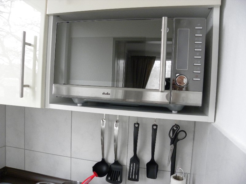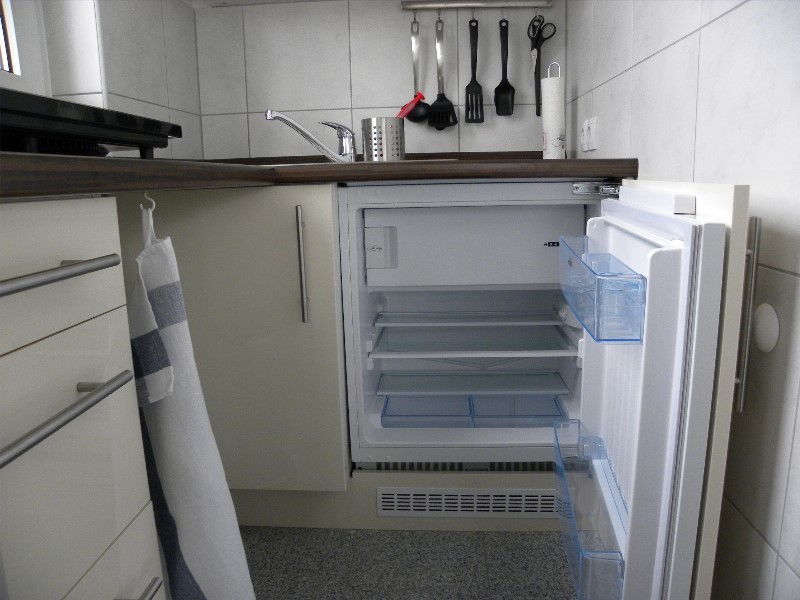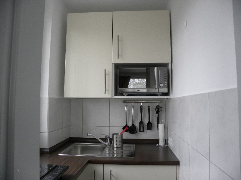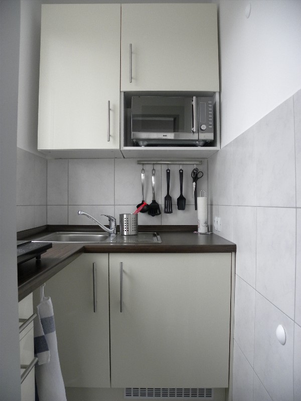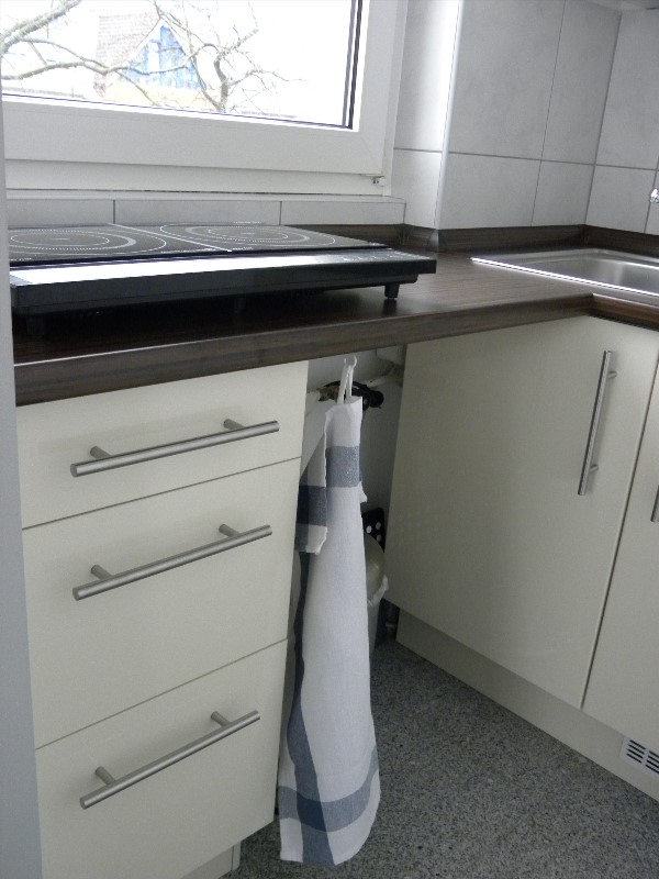 Voll ausgestattet: 2 Induktions-Kochfelder, Mikrowelle inkl. Grillstufe, Kühlschrank, Wasserkocher, Geschirr & Besteck.