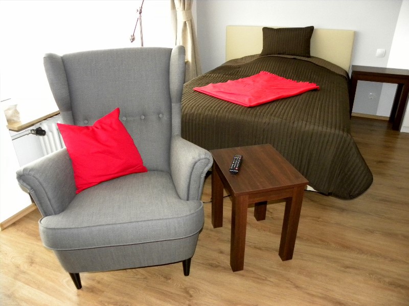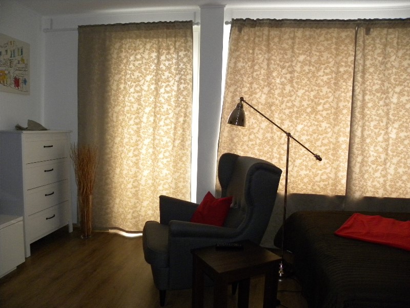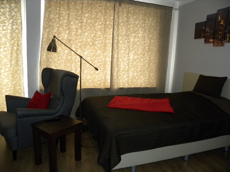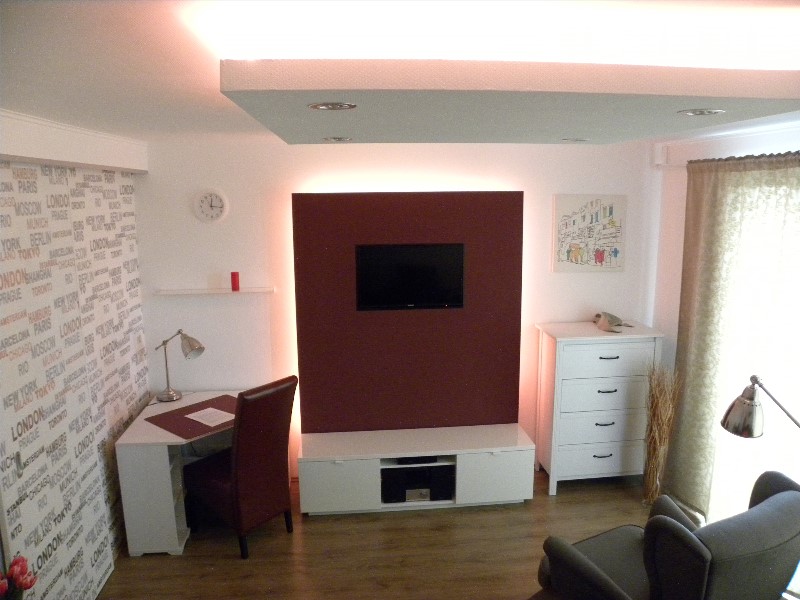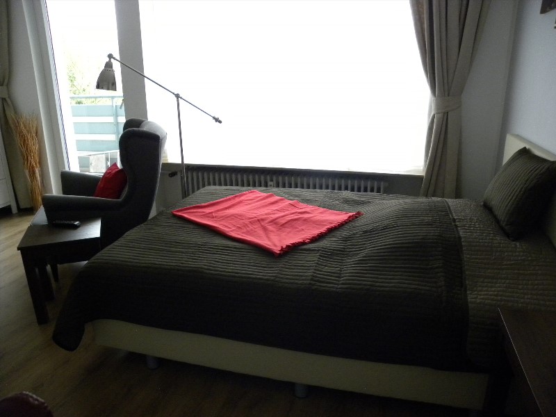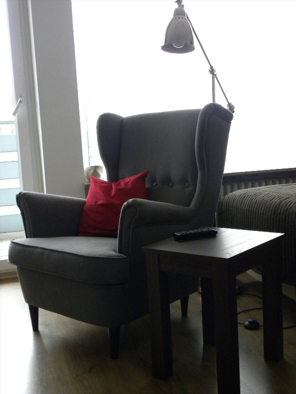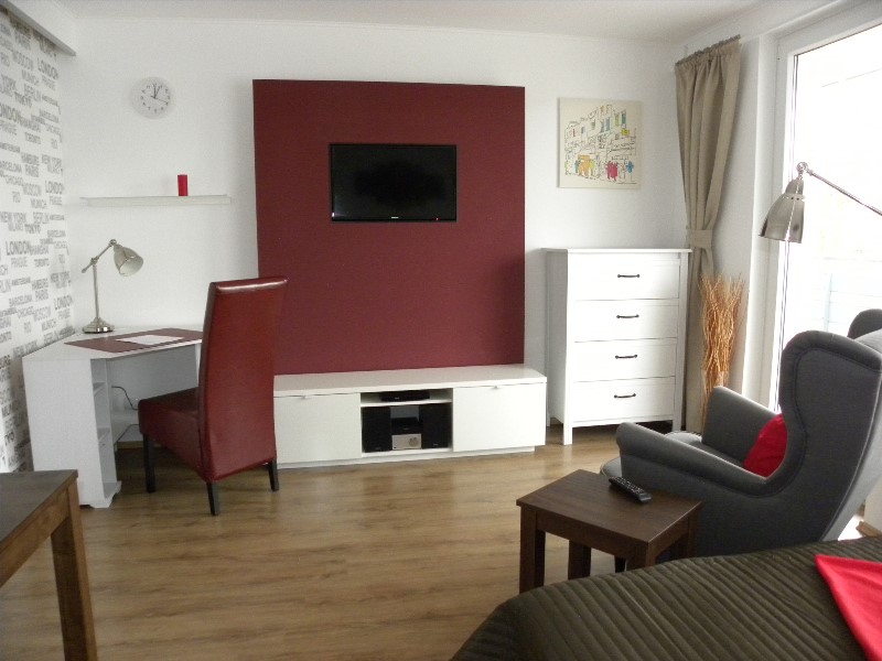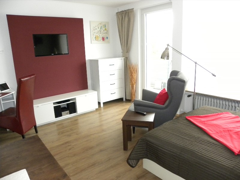 Ohrensessel, Flatscreen-TV, DVD-Player, Radio/CD, WLAN, Essbereich, Beleuchtung inkl. Ambientlight. Bequemes Bett 140cm breit, Kleiderschrank, Kommode, Bettwäsche inklusive Farbauswahl.